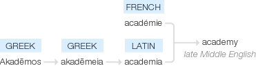 late Middle English (denoting the garden where Plato taught): from French académie or Latin academia, from Greek akadēmeia, from Akadēmos, the hero after whom Plato's garden was named.