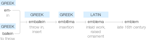 late 16th century (as a verb): from Latin emblema ‘inlaid work, raised ornament’, from Greek emblēma ‘insertion’, from emballein ‘throw in, insert’, from em- ‘in’ + ballein ‘to throw’.