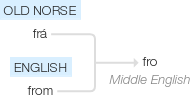 From Middle English fro, fra, from Old English fra(“from”), from Old Norse frá(“from”), from Proto-Germanic *fram(“from”), from Proto-Indo-European *promo-(“forth, forward”). Cognate with Scots frae(“fro, from”), Icelandic frá(“from”). More at from.
