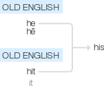 Old English, genitive singular form of he, hē ‘he’ and hit ‘it’.