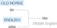 Adjective from Middle English like, lyke, from Old English ġelīċ by shortening, influenced by Old Norse líkr, glíkr; both from Proto-Germanic *galīkaz(“like, similar, same”). Related to alike; more distantly, with lich and -ly. Cognate with West Frisian like(“like; as”), Saterland Frisian gliek(“like”), Danish lig(“alike”), Dutch gelijk(“like, alike”), German gleich(“equal, like”), Icelandic líkur(“alike, like, similar”), Norwegian lik(“like, alike”)Swedish lik(“like, similar”)